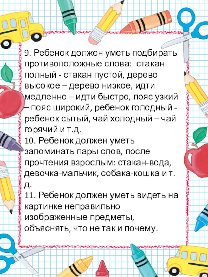 9. Ребенок должен уметь подбирать противоположные слова: стакан полный - стакан