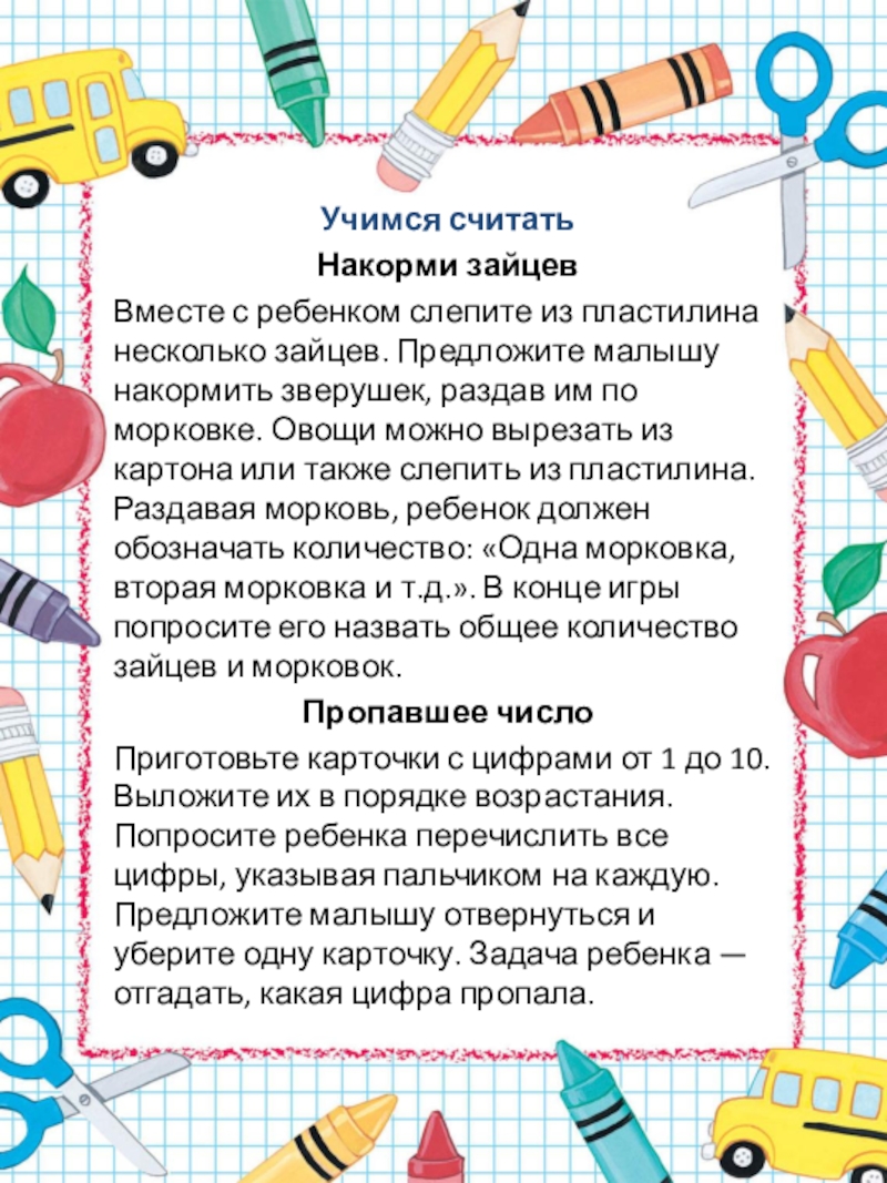 3. Ребенок должен знать все цифры (0, 1, 2, 3, 4, 5, 6, 7, 8, 9). Считать предметы в пределах десяти, соотносить количество предметов с нужной цифрой.