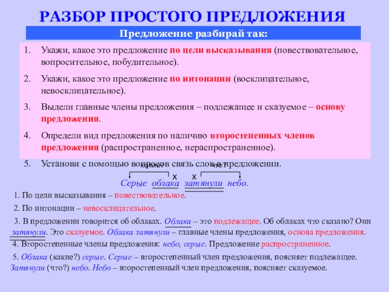 5. Облака (какие?) серые. Серые – второстепенный член предложения, поясняет подлежащее. Затянули (что?) небо. Небо – второстепенный член предложения, поясняет сказуемое.
