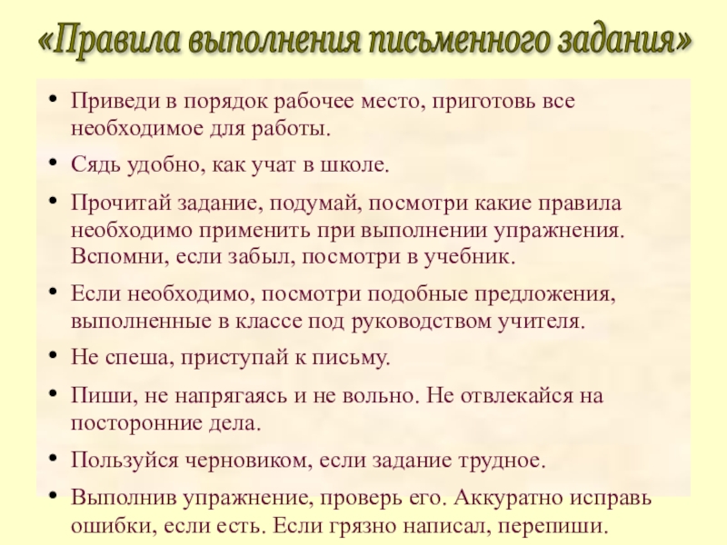 «Правила выполнения письменного задания»