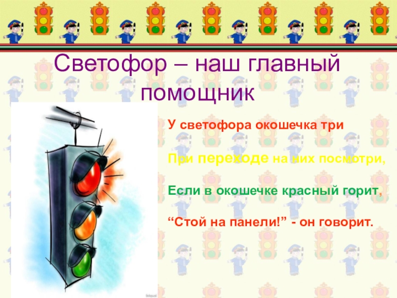 Светофор – наш главный помощникУ светофора окошечка триПри переходе на них посмотри,Если в окошечке красный горит,“Стой на панели!” - он говорит.