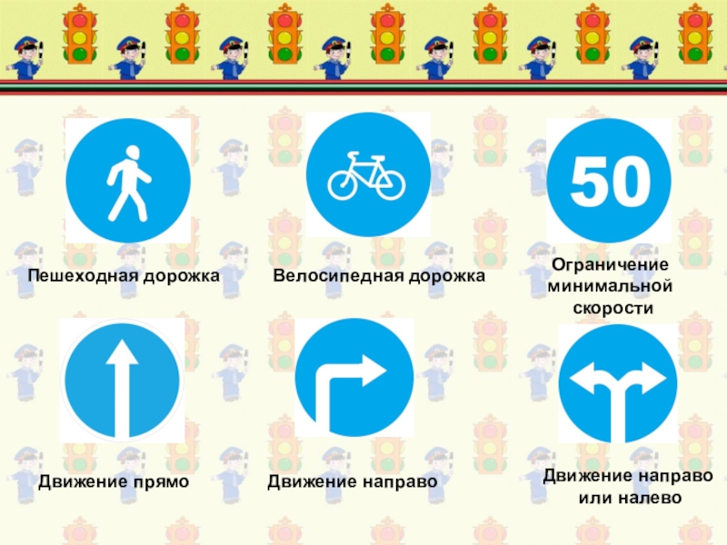 Пешеходная дорожкаВелосипедная дорожкаОграничение минимальной скоростиДвижение прямоДвижение направоДвижение направо или налево