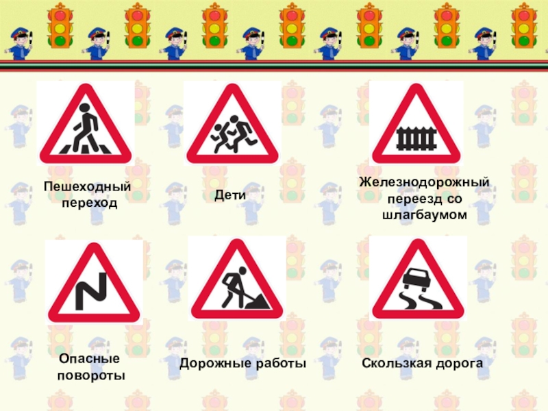 Пешеходный переходДетиОпасные поворотыДорожные работыСкользкая дорогаЖелезнодорожный переезд со шлагбаумом