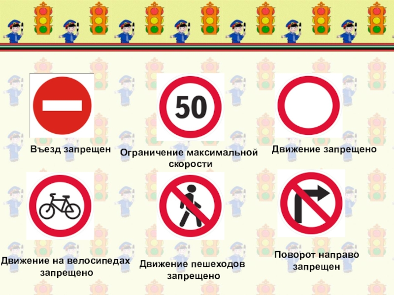 Ограничение максимальной скоростиДвижение запрещеноВъезд запрещенДвижение на велосипедах запрещеноДвижение пешеходов запрещеноПоворот направо запрещен
