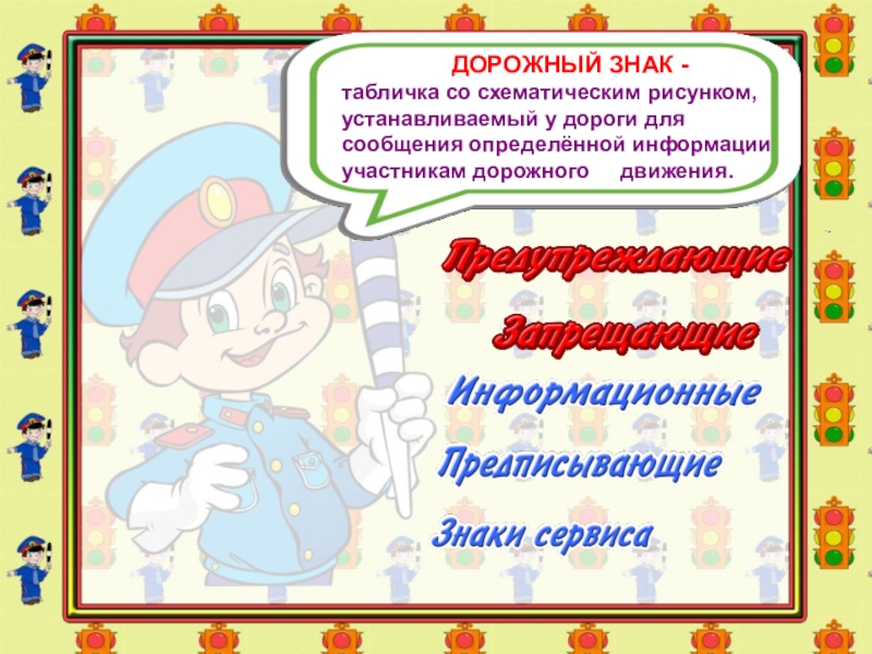 ДОРОЖНЫЙ ЗНАК -табличка со схематическим рисунком, устанавливаемый у дороги для сообщения определённой информации участникам дорожного