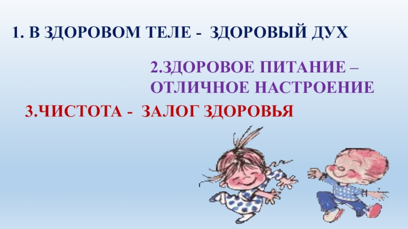 1. В ЗДОРОВОМ ТЕЛЕ - ЗДОРОВЫЙ ДУХ2.ЗДОРОВОЕ ПИТАНИЕ – ОТЛИЧНОЕ НАСТРОЕНИЕ3.ЧИСТОТА - ЗАЛОГ ЗДОРОВЬЯ