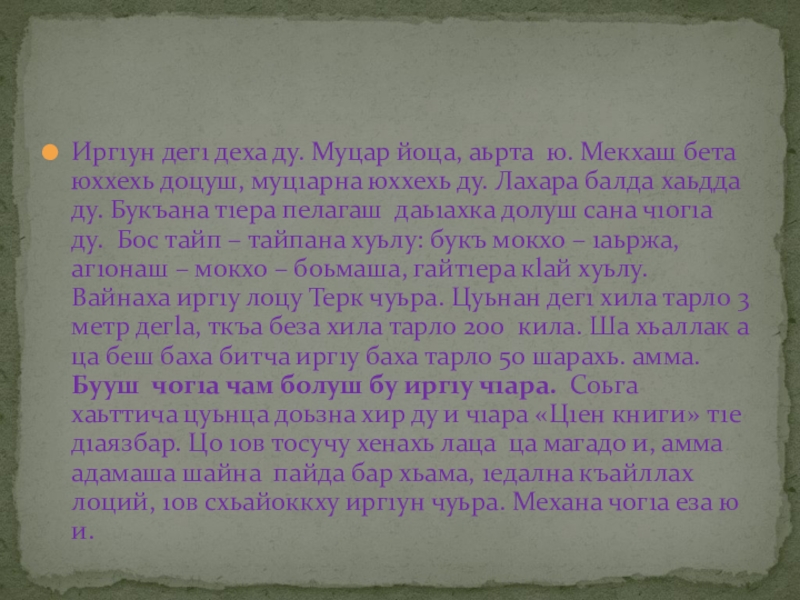 Первомайски lома чуьра. Суна хезнера, цхьацца волчо саза чlерах шена уьшал хьожа йогlу олуш. Хlинца хаьа сунна хьунда йогlу цунах уьшал хьожа: иза шена цхьа кхерам хилча татталой хин бухарчу саццlара боьду.