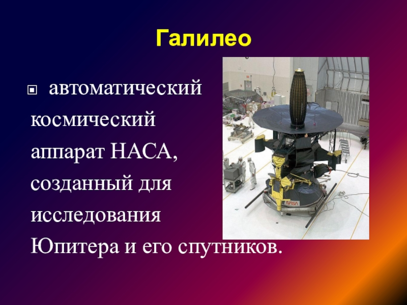 Галилеоавтоматический космический аппарат НАСА, созданный для исследования Юпитера и его спутников.