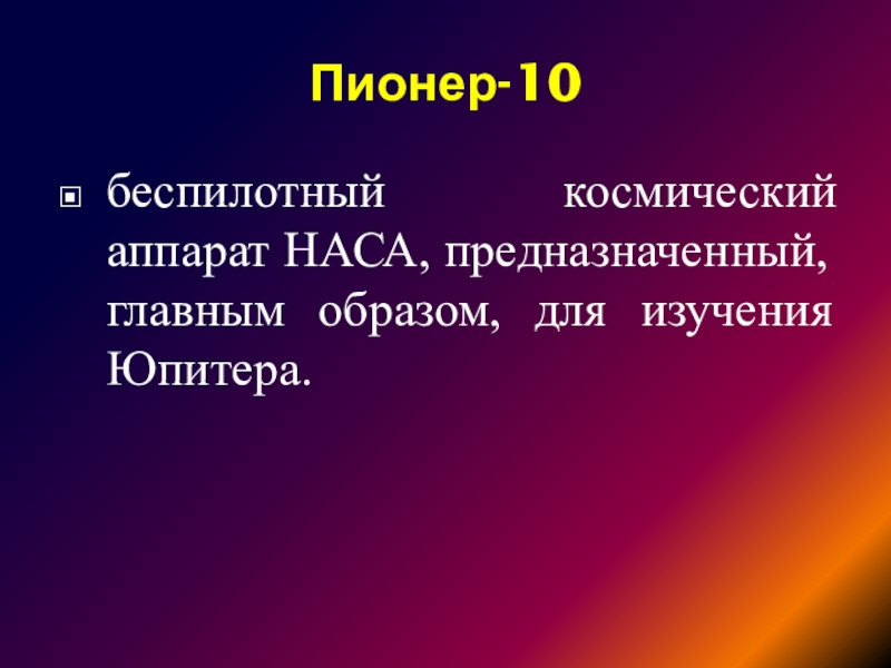 Пионер-10беспилотный космический аппарат НАСА, предназначенный, главным образом, для изучения Юпитера.