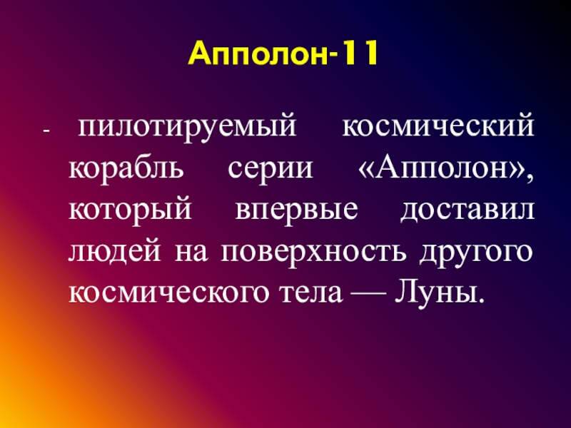 Апполон-11- пилотируемый космический корабль серии «Апполон», который впервые доставил людей на поверхность другого космического тела — Луны.