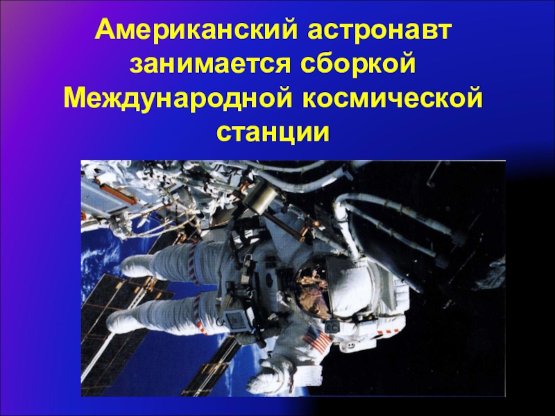 Слайд 33Американский астронавт занимается сборкой Международной космической станции