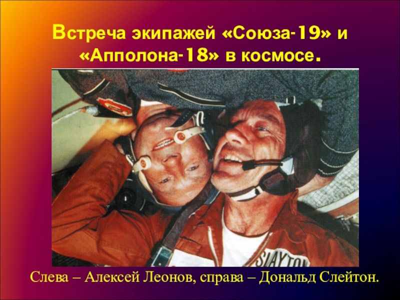 Слайд 32 Встреча экипажей «Союза-19» и «Апполона-18» в космосе.
