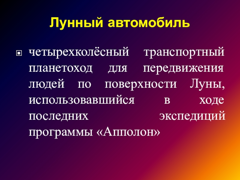 Лунный автомобильчетырехколёсный транспортный планетоход для передвижения людей по поверхности Луны, использовавшийся в ходе последних экспедиций программы «Апполон»