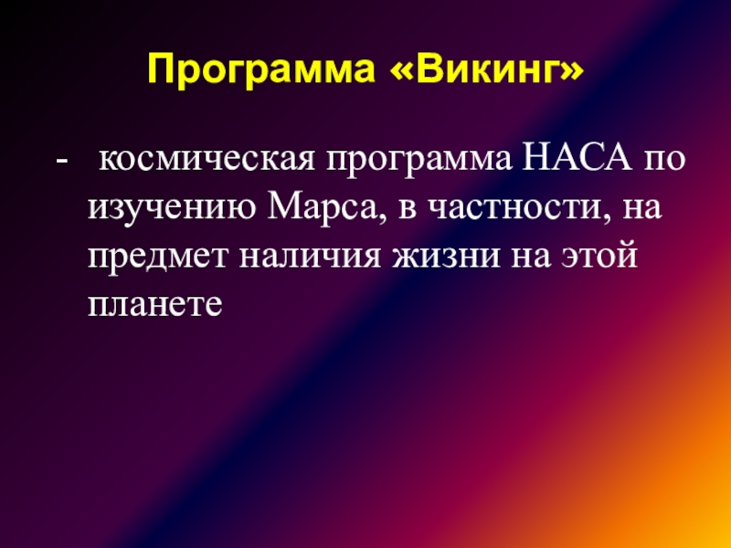 Программа «Викинг»-  космическая программа НАСА по изучению Марса, в частности, на предмет наличия жизни на этой