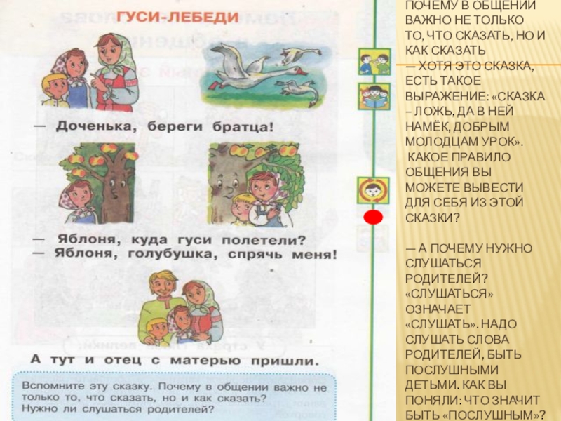 — А почему нужно слушаться родителей? «Слушаться» означает «слушать». Надо слушать слова родителей, быть послушными детьми. Как вы поняли: что значит быть «послушным»?
