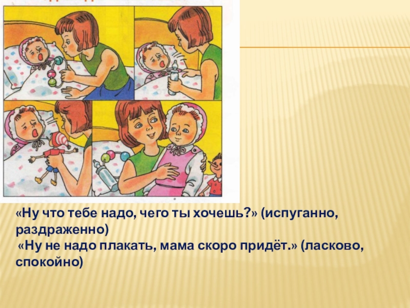 Слайд 5Кто сможет прочитать, что говорит девочка успокоенному малышу на последней картинке?