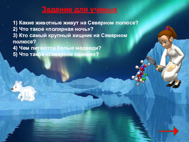 Задание для ученых1) Какие животные живут на Северном полюсе?2) Что такое «полярная ночь»?3) Кто самый крупный хищник