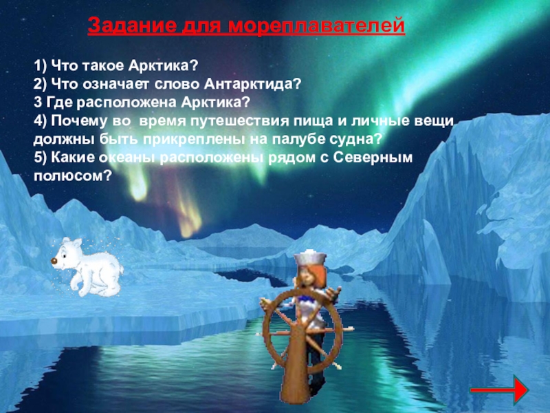 Задание для мореплавателей1) Что такое Арктика?2) Что означает слово Антарктида?3 Где расположена Арктика?4) Почему во время