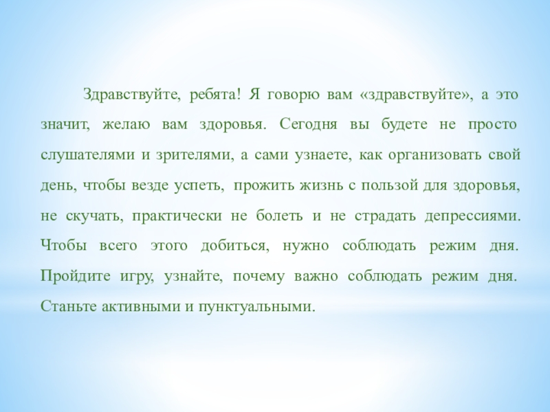 значит, желаю вам здоровья. Сегодня вы будете не просто слушателями и зрителями, а сами узнаете, как организовать свой день, чтобы везде успеть, прожить жизнь с пользой для здоровья, не скучать, практически не болеть и не страдать депрессиями. Чтобы всего этого добиться, нужно соблюдать режим дня. Пройдите игру, узнайте, почему важно соблюдать режим дня. Станьте активными и пунктуальными.