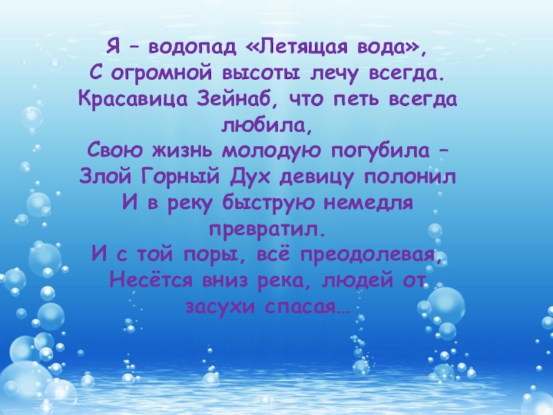 Я – водопад «Летящая вода»,С огромной высоты лечу всегда.Красавица Зейнаб, что петь всегда любила,Свою жизнь молодую погубила