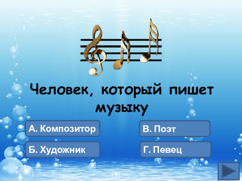А. КомпозиторБ. Художник В. ПоэтГ. Певец Человек, который пишет музыку