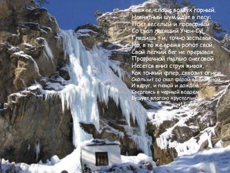 Свежее, слаще воздух горный.Невнятный шум идёт в лесу:Поёт весёлый и проворныйСо скал летящий Учан-Су!Глядишь – и, точно