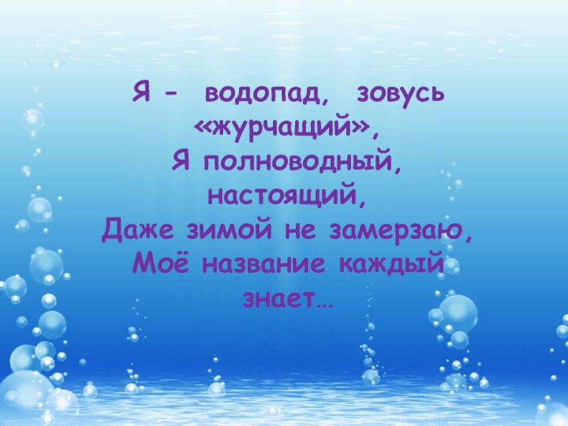 Я - водопад, зовусь «журчащий»,Я полноводный, настоящий,Даже зимой не замерзаю,Моё название каждый знает…