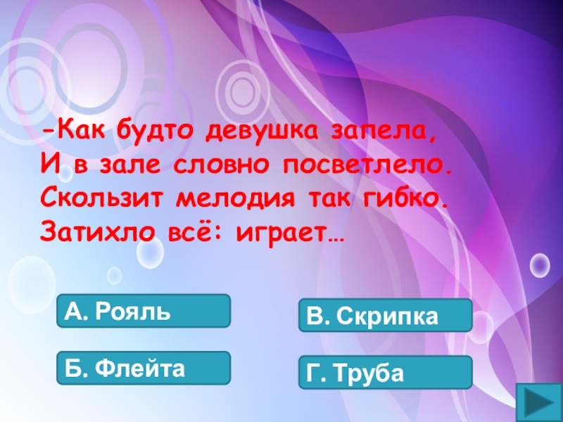А. РояльБ. ФлейтаВ. СкрипкаГ. Труба-Как будто девушка запела,И в зале словно посветлело.Скользит мелодия так гибко.Затихло всё: играет…