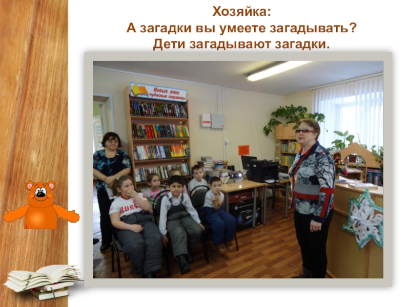 Слайд 12Хозяйка:  А загадки вы умеете загадывать? Дети загадывают загадки.