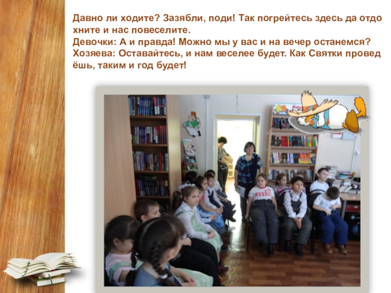 Слайд 8Давно ли ходите? Зазябли, поди! Так погрейтесь здесь да отдохните и нас повеселите. Девочки: А и правда! Можно мы у вас и на вечер останемся? Хозяева: Оставайтесь, и нам веселее будет. Как Святки проведёшь, таким и год будет!