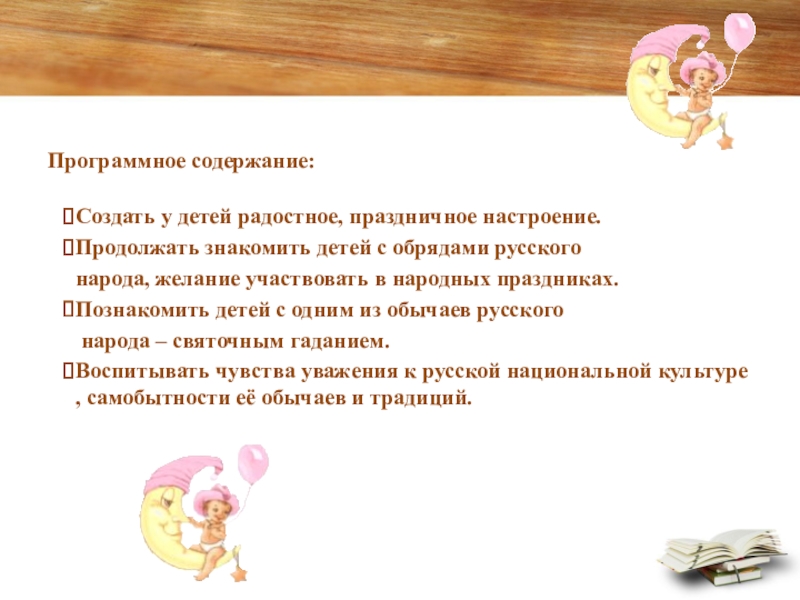 Программное содержание:Создать у детей радостное, праздничное настроение.Продолжать знакомить детей с обрядами русского народа, желание участвовать в народных праздниках.Познакомить детей с одним из обычаев русского народа – святочным гаданием.Воспитывать чувства уважения к русской национальной культуре, самобытности её обычаев и традиций.