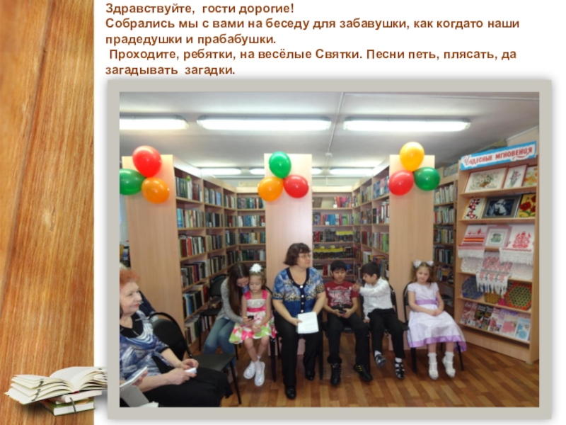 Слайд 3Здравствуйте,  гости дорогие! Собрались мы с вами на беседу для забавушки, как когда­то наши  прадедушки и прабабушки.  Проходите, ребятки, на весёлые Святки. Песни петь, плясать, да  загадывать  загадки.
