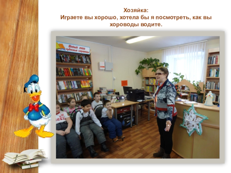 Слайд 10 Хозяйка:  Играете вы хорошо, хотела бы я посмотреть, как вы  хороводы водите.