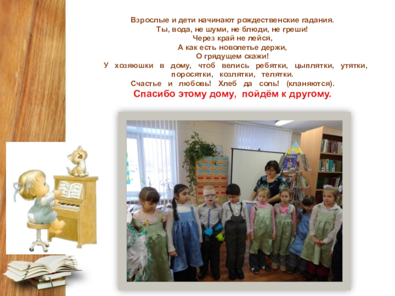 Слайд 13 Взрослые и дети начинают рождественские гадания. Ты, вода, не шуми, не блюди, не греши! Через край не лейся,  А как есть новолетье держи,  О грядущем скажи!   У   хозяюшки   в   дому,   чтоб