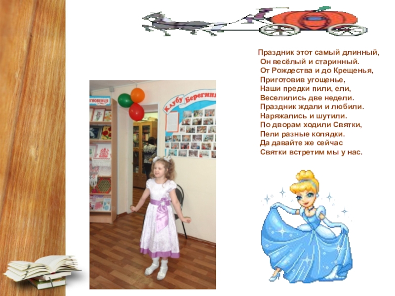 Слайд 4 Праздник этот самый длинный,                 Он весёлый и старинный.                 От Рождества и до Крещенья,                 Приготовив угощенье,                 Наши предки пили, ели,                 Веселились две недели.                 Праздник ждали и любили.                 Наряжались и шутили.                 По дворам ходили Святки,                 Пели разные колядки.                 Да давайте же сейчас                 Святки встретим мы у нас.