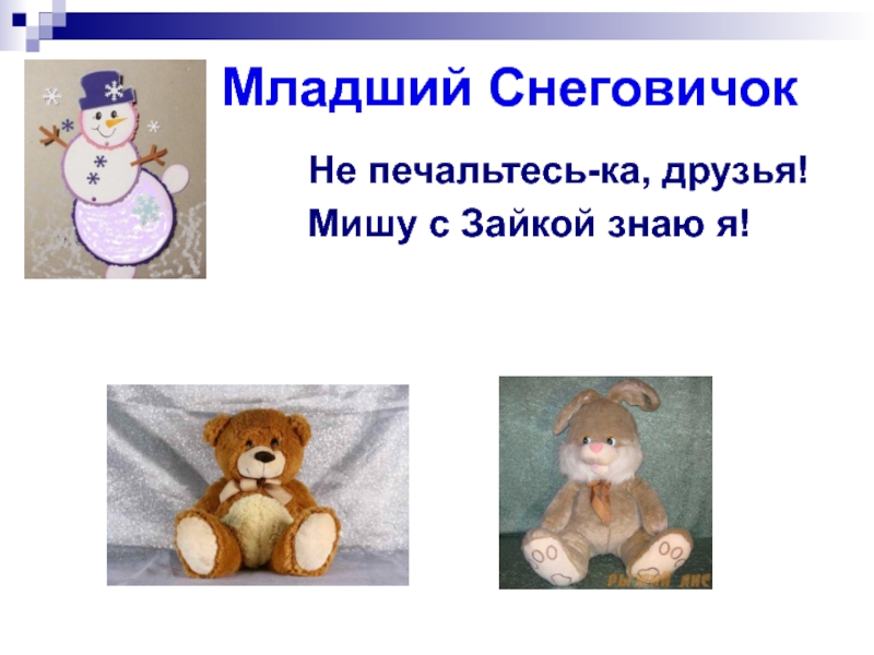 Младший СнеговичокНе печальтесь-ка, друзья!Мишу с Зайкой знаю я!