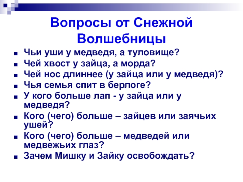 Вопросы от Снежной ВолшебницыЧьи уши у медведя, а туловище?Чей хвост у зайца, а морда?Чей нос длиннее (у