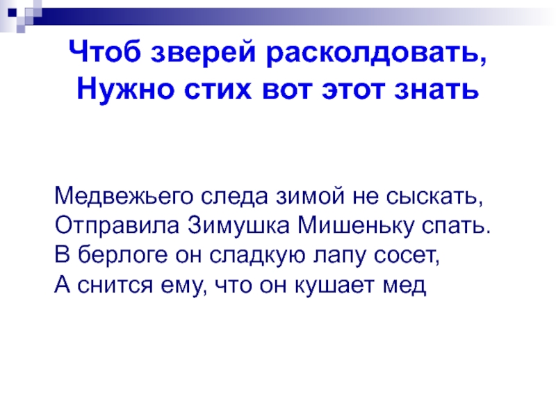 Чтоб зверей расколдовать, Нужно стих вот этот знать  Медвежьего следа зимой не сыскать, Отправила Зимушка Мишеньку