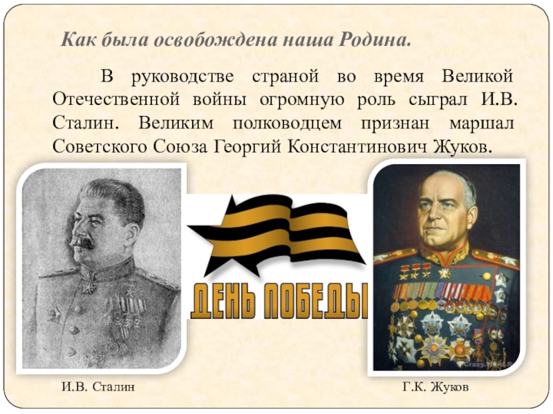Великой Отечественной войны огромную роль сыграл И.В. Сталин. Великим полководцем признан маршал Советского Союза Георгий Константинович Жуков.