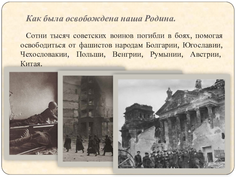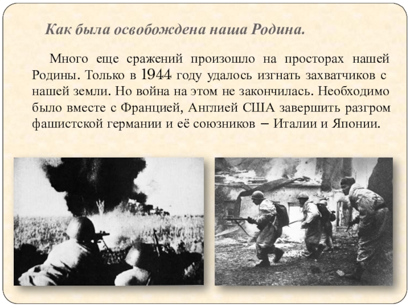 просторах нашей Родины. Только в 1944 году удалось изгнать захватчиков с нашей земли. Но война на этом не закончилась. Необходимо было вместе с Францией, Англией США завершить разгром фашистской германии и её союзников – Италии и Японии.