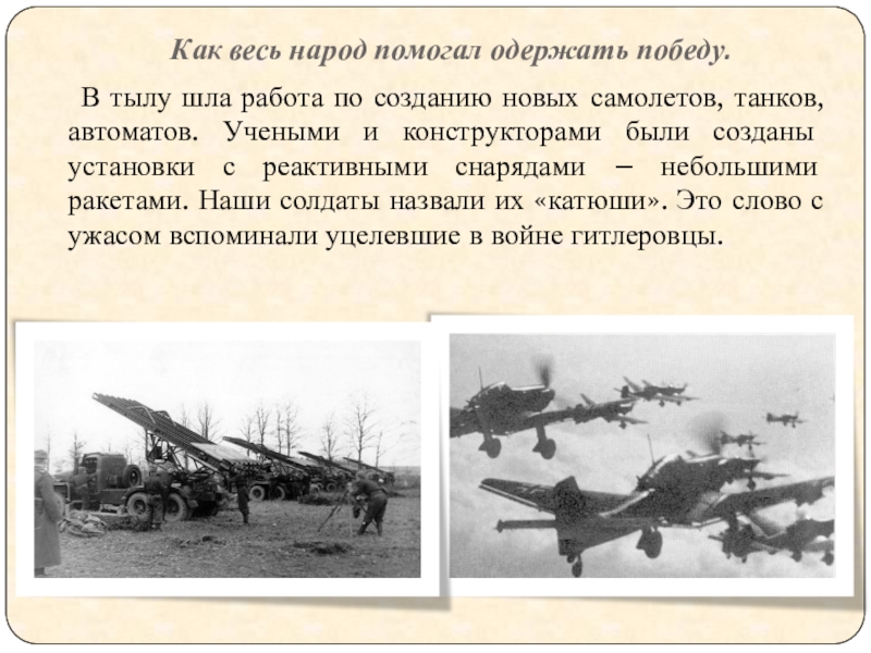 по созданию новых самолетов, танков, автоматов. Учеными и конструкторами были созданы установки с реактивными снарядами – небольшими ракетами. Наши солдаты назвали их «катюши». Это слово с ужасом вспоминали уцелевшие в войне гитлеровцы.