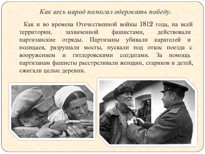 Отечественной войны 1812 года, на всей территории, захваченной фашистами, действовали партизанские отряды. Партизаны убивали карателей и полицаев, разрушали мосты, пускали под откос поезда с вооружением и гитлеровскими солдатами. За помощь партизанам фашисты расстреливали женщин, стариков и детей, сжигали целые деревни.