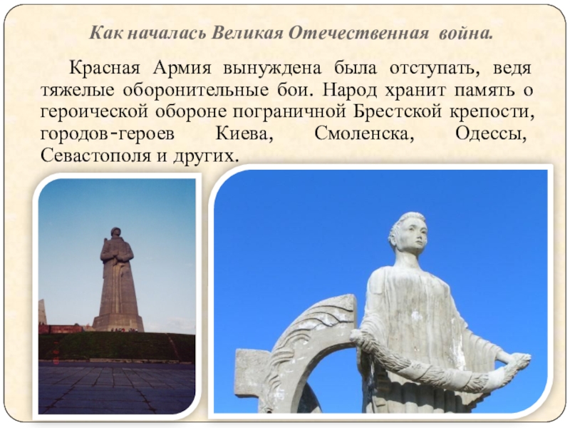ведя тяжелые оборонительные бои. Народ хранит память о героической обороне пограничной Брестской крепости, городов-героев Киева, Смоленска, Одессы, Севастополя и других.
