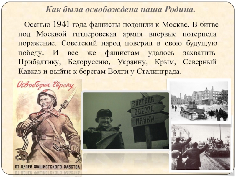 подошли к Москве. В битве под Москвой гитлеровская армия впервые потерпела поражение. Советский народ поверил в свою будущую победу. И все же фашистам удалось захватить Прибалтику, Белоруссию, Украину, Крым, Северный Кавказ и выйти к берегам Волги у Сталинграда.