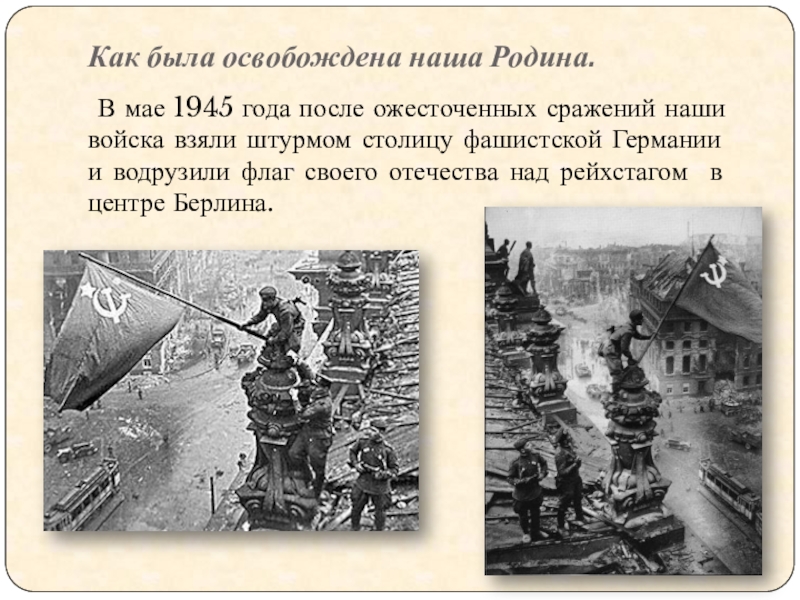 ожесточенных сражений наши войска взяли штурмом столицу фашистской Германии и водрузили флаг своего отечества над рейхстагом в центре Берлина.