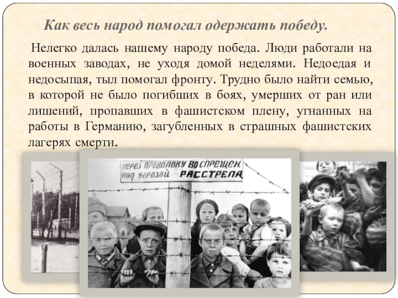 победа. Люди работали на военных заводах, не уходя домой неделями. Недоедая и недосыпая, тыл помогал фронту. Трудно было найти семью, в которой не было погибших в боях, умерших от ран или лишений, пропавших в фашистском плену, угнанных на работы в Германию, загубленных в страшных фашистских лагерях смерти.