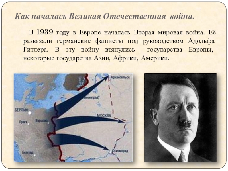 началась Вторая мировая война. Её развязали германские фашисты под руководством Адольфа Гитлера. В эту войну втянулись государства Европы, некоторые государства Азии, Африки, Америки.
