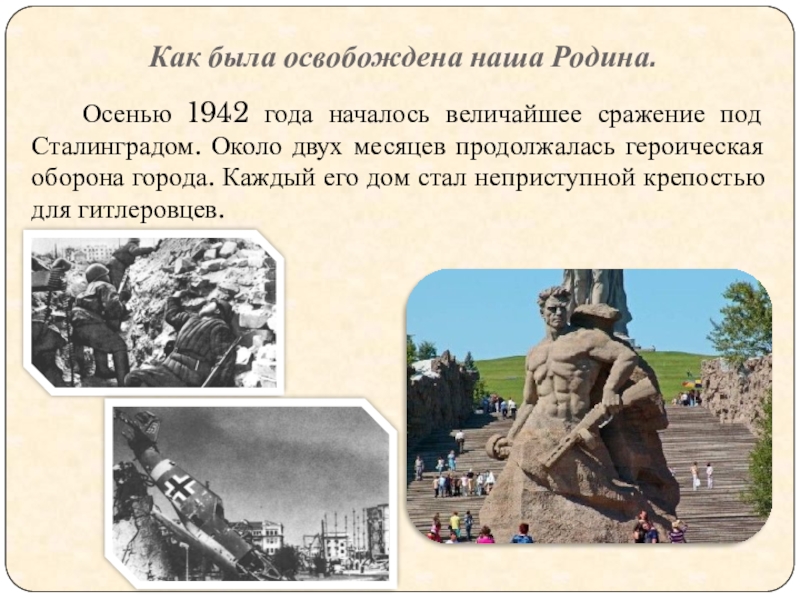 величайшее сражение под Сталинградом. Около двух месяцев продолжалась героическая оборона города. Каждый его дом стал неприступной крепостью для гитлеровцев.