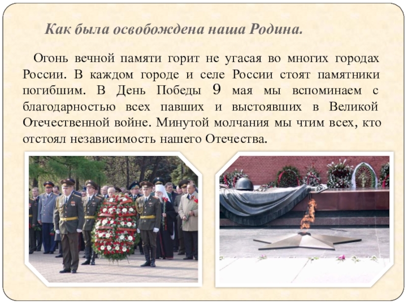 угасая во многих городах России. В каждом городе и селе России стоят памятники погибшим. В День Победы 9 мая мы вспоминаем с благодарностью всех павших и выстоявших в Великой Отечественной войне. Минутой молчания мы чтим всех, кто отстоял независимость нашего Отечества.