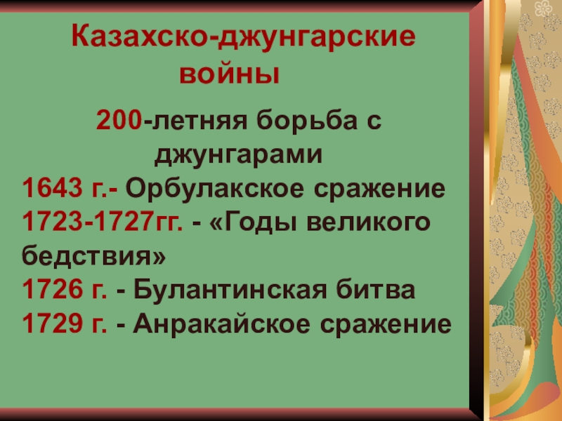 4. Этот хан возглавил борьбу казахов с джунгарами.